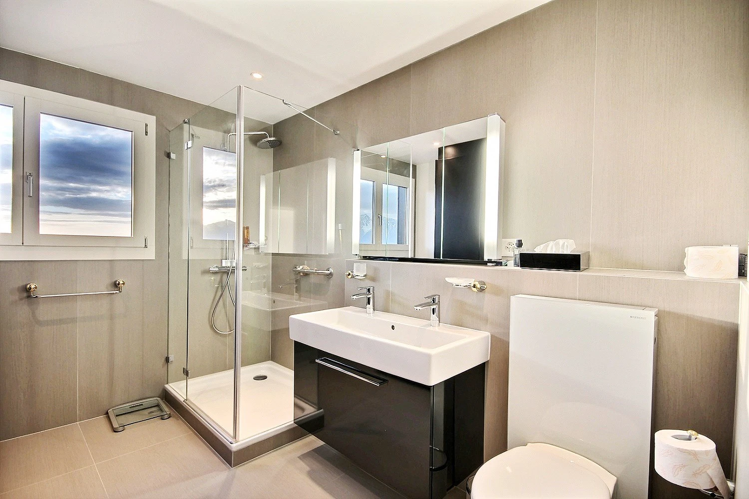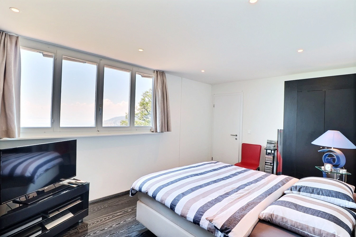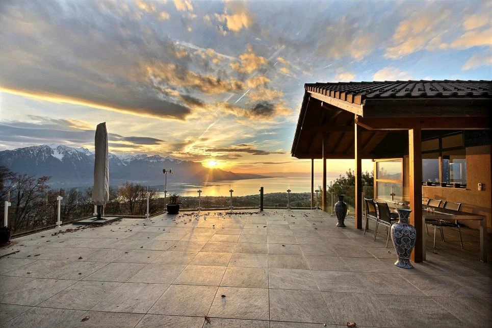Sa position dominante lui permet de bénéficier d'une vue panoramique grandiose sur le bassin lémanique avec les Alpes en arrière plan.