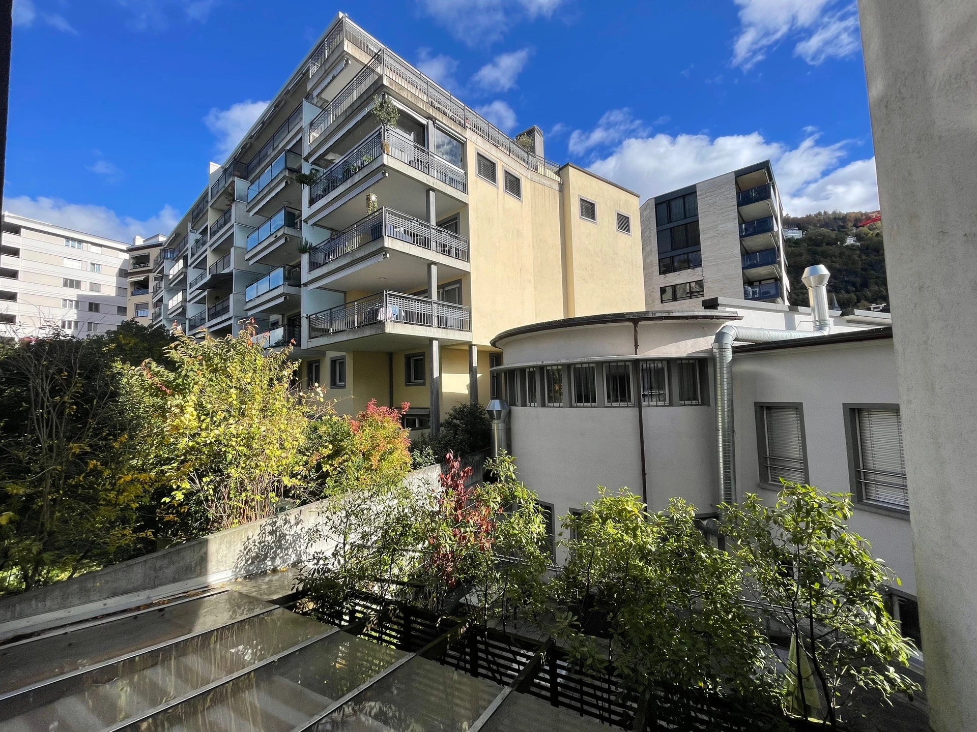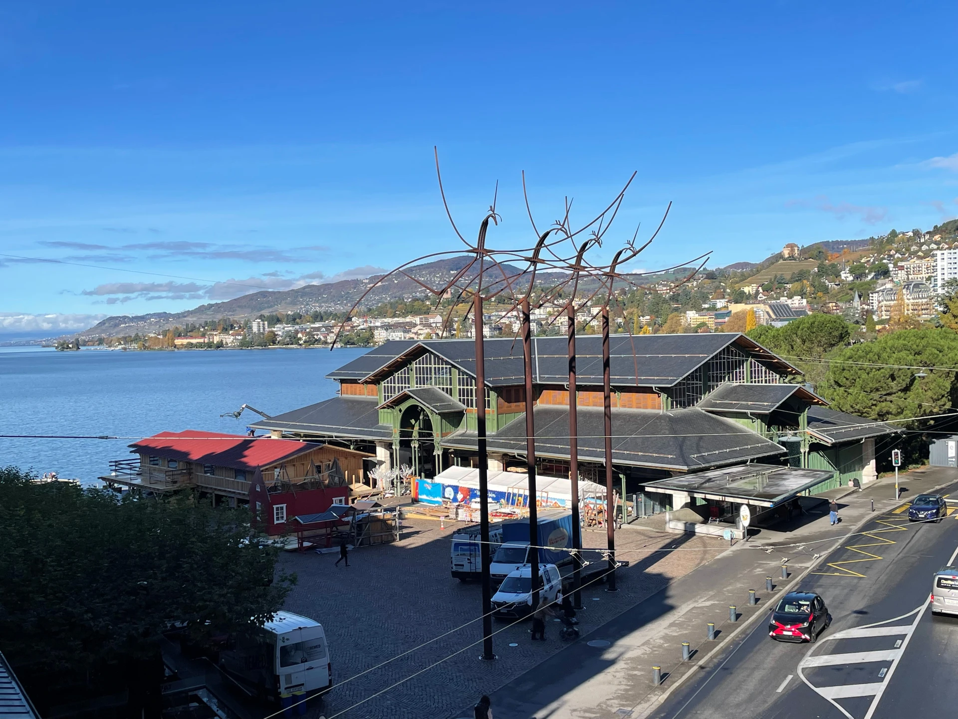 2 balcons d'environ 10 m2 chacun avec une vue oblique dégagée sur le lac Léman et la place du marché de Montreux.